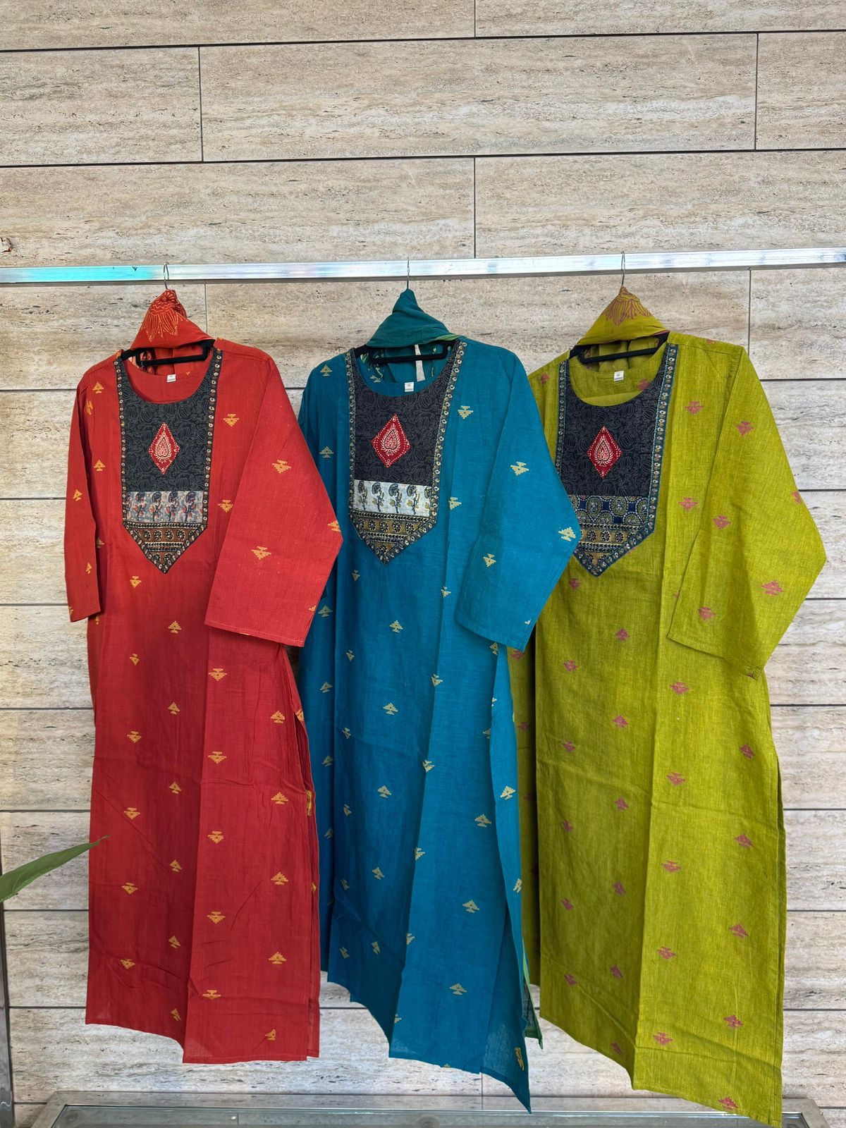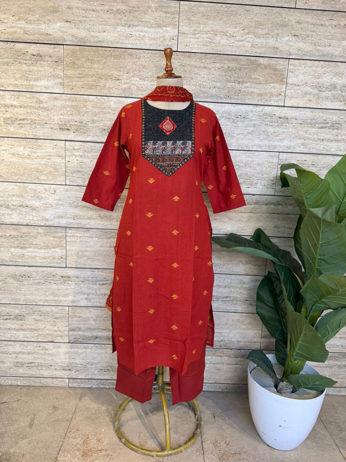 Elegant and breathable, this rust red handloom cotton suit set features delicate jamdani motifs and a beautifully detailed Jaipuri printed patchwork yoke that adds a traditional touch to the neckline. Paired with a lightweight printed cotton dupatta and comfortable cotton bottom, this A-line kurta with side slits offers effortless style and comfort, making it perfect for everyday wear, office wear, and warm summer days.