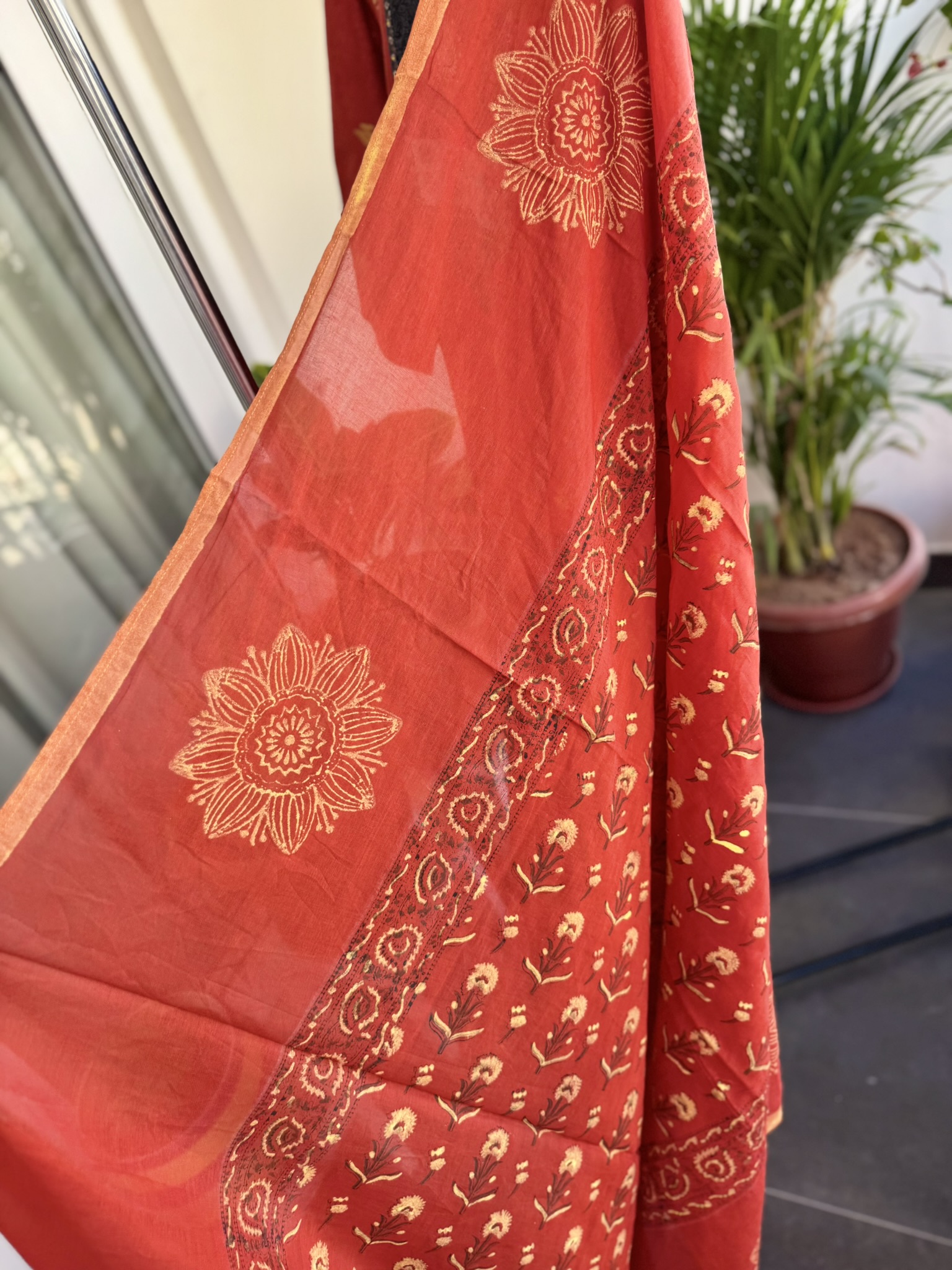 • Color: Rust Red with mustard jamdani motifs